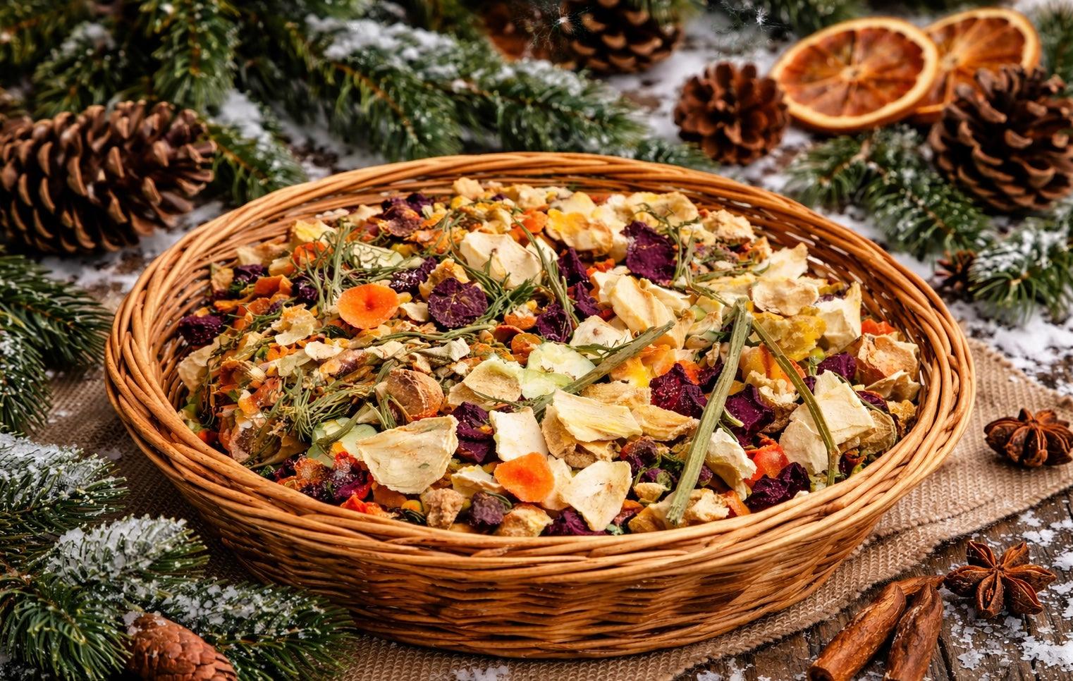 Das Winterfutter besteht weiterhin aus einer gesunden Strukturmischung wie unsere Müsli Mixe zur freien Verfügung, nun dürfen getrocknete Kräuter, Blätter, Fettsaaten, auch Hafer-, Gemüseflocken sowie Rinden und Wurzeln nicht fehlen. Wir halten unter anderem spezielle Jahreszeitmischungen im Onlinesortiment für die Winterzeit bereit. Im Dezember ist es wieder Zeit für Intestinal Cure und Vita Pro. Ein wenig frisches Wurzelgemüse enthält viele Kohlenhydrate welche nun ein guter Energielieferant dar stellen. Aber aufgepasst! Zu kaltes oder gefrorenes Futter kann zu gefährlichen Verdauungsstörungen führen. Welches die richtige Menge ist muss individuell getestet werden. aAls Faustregel gilt immer noch das der Futternapf bei der kommenden Fütterung leer sein muss. Gefüllte Heuraufen sind natürlich weiterhin Pflicht und so werden diese wie immer täglich frisch befüllt, nicht gefressenes Heu kann dann in der Schlafecke verteilt werden und Trinkwasser sollte nun idealer Weise mindestens 2x täglich lauwarm gereicht werden.